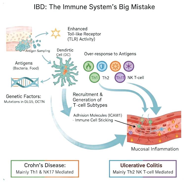 - Different immune cells drive Crohn’s and ulcerative colitis: Crohn’s disease is driven mostly by Th1 and Th17 immune cells, while ulcerative colitis is fuelled by Th2, Th9, and natural killer (NK) T cells. Each type releases its own set of cytokines—tiny messengers like TNF-?, IFN-?, and IL-13—that keep the gut inflamed.