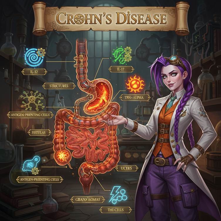 The inflammation in Crohn’s disease happens because immune cells release chemicals called cytokines—such as IL-12, IL-17, TNF-?, and IFN-?—that cause and keep the swelling going [5].